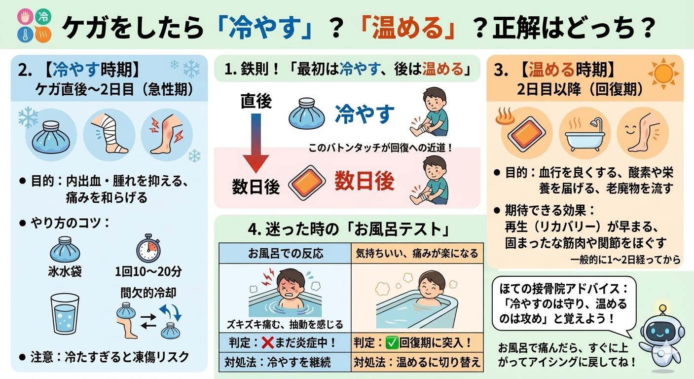 スポーツや日常生活でうっかりケガをしてしまった時、「氷で冷やすべき?」「お風呂で温めたほうがいい?」と迷ったことはありませんか?実は、この選択を間違えると治りが遅くなってしまうこともあるんです。