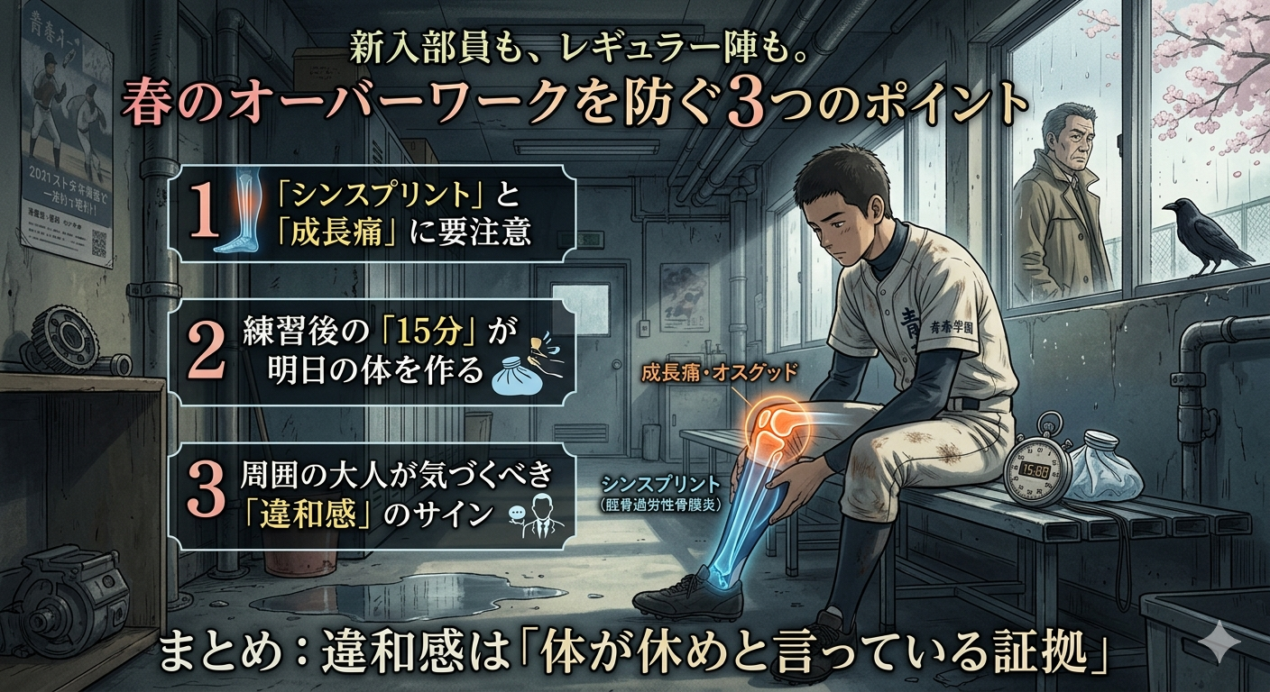 少しでも違和感があれば、早めに専門家へ相談しましょう。正しい知識とケアで、この春を怪我なく乗り切り、最高のシーズンをスタートさせましょう!