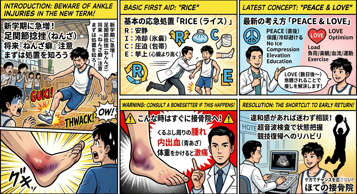 TOP > ブログ > 足首をひねったらどうする?知っておきたい応急処置の基本「RICE」と「PEACE & LOVE」