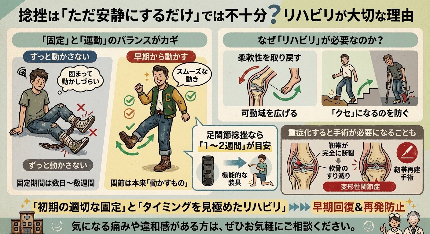 捻挫の回復を早め、再発させないためには、**「初期の適切な固定」と「タイミングを見極めたリハビリ」**の両立が不可欠です。